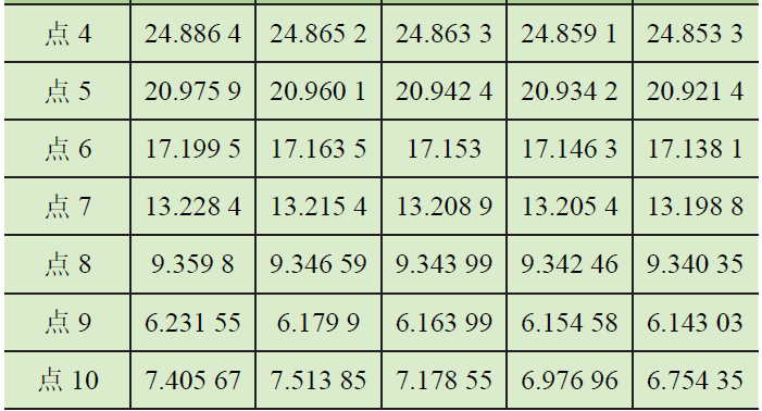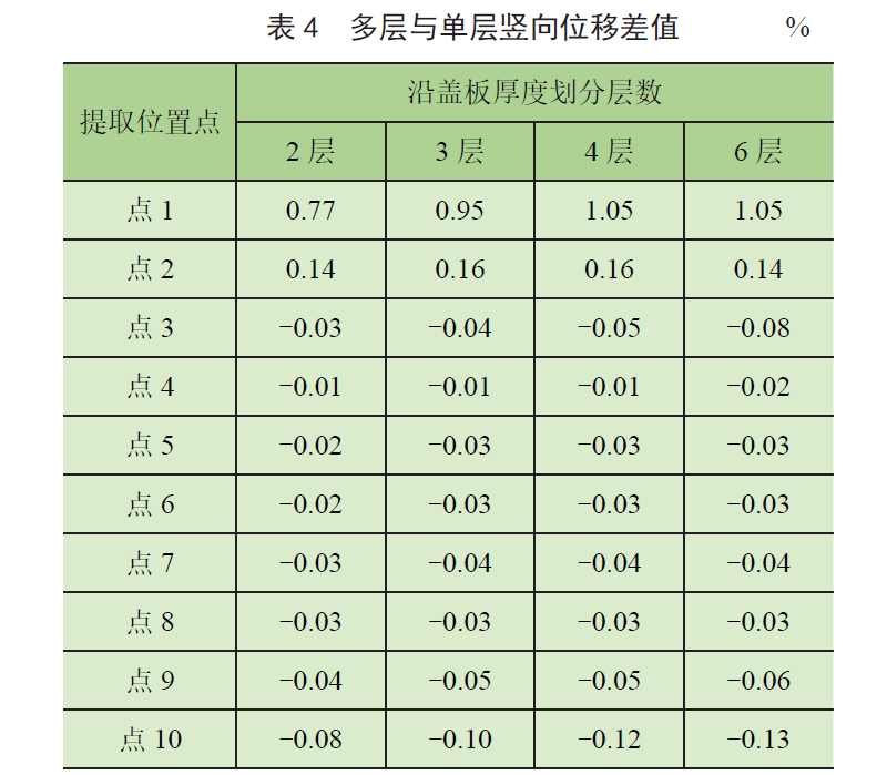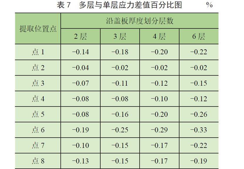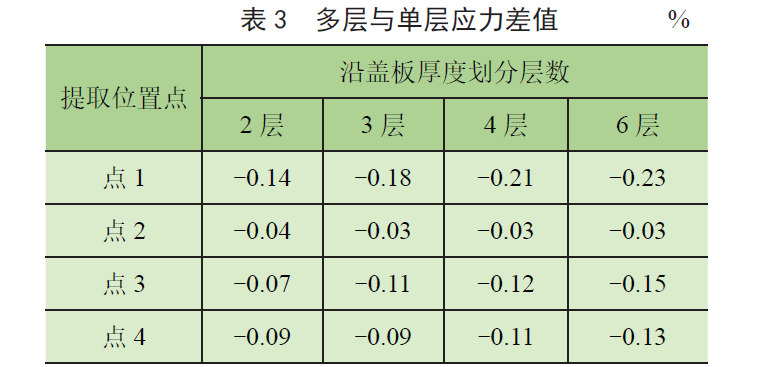 由竖向位移对比结果可知:在约束、载荷、板平面方向网格等条件相同的情况下,沿厚度方向划分层数对应力值影响较小;以单层计算值为基础,划分6 层网格、点1 处与单层计算差值最大,最大差比为1.05%,差值较小,如表4所示。