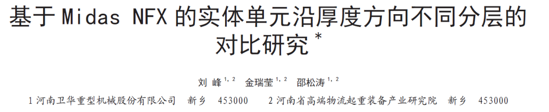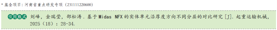 文中对于同一结构件,在面板平面网格划分尺寸相同的情况下,沿板厚度方向划分单层网格和多层网格,分别提取同一位置点的强度、刚度结果,并进行横纵向对比,以判断起重机梁在额定载荷、自重、水平惯性载荷等单载荷或组合载荷作用下,沿板厚度方向单层划分计算结果的可参考性。从而减小划分网格的难度和计算的时间成本,使仿真计算过程更简单、高效,既保证了计算结果的安全性,也有助于缩短设计周期。