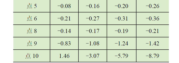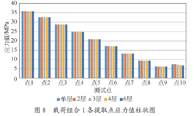 由载荷组合2 计算应力对比结果可知:在约束、载荷、板平面方向网格等条件相同的情况下,悬臂梁上盖板沿厚度方向划分层数对应力值影响较小;以单层计算值为基础,划分6 层网格、点10 处与单层计算差值最大,最大差比为8.76%,处于突变状态,因此点最靠近加载区,应力计算值只能作为参考,不能采纳;其余点各层与单层的差值比都较小,不超1.5%,如表7 所示。