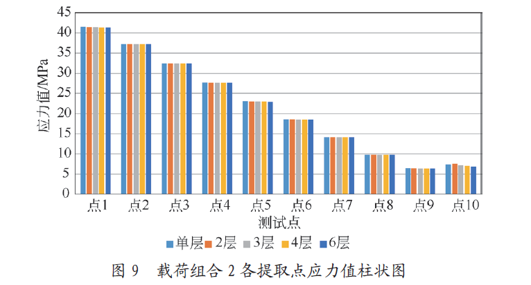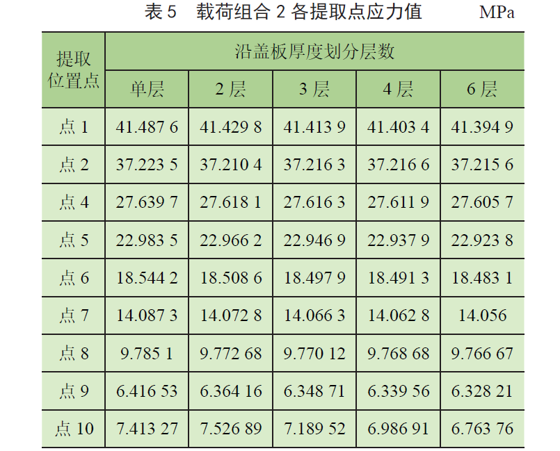 由载荷组合1 计算应力对比结果可知:在约束、载荷、板平面方向网格等条件相同的情况下,悬臂梁上盖板沿厚度方向划分层数对应力值影响较小;以单层计算值为基础,划分6 层网格、点10 处与单层计算差值最大,最大差比为8.79%,处于突变状态,因此点最靠近加载区,应力计算值只能作为参考,不采纳;其余点各层与单层的差值比都比较小,不超1.5%,如表3 所示。