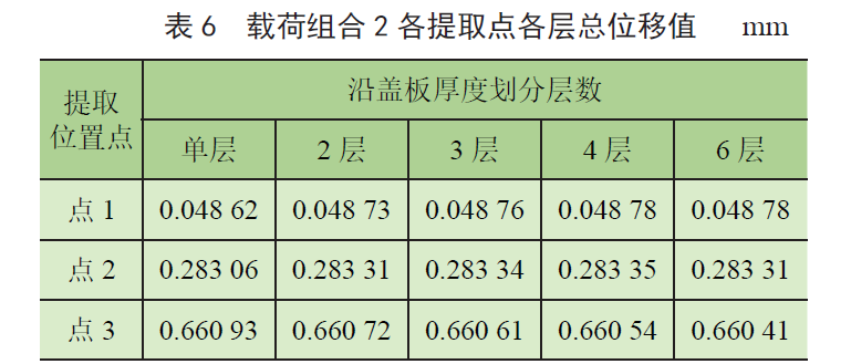 悬臂梁上盖板除厚度外沿平面划分网格为50mm×50mm,载荷组合2沿厚度划分不同层数的计算应力值及总位移值,如表5、表6、图9 所示。