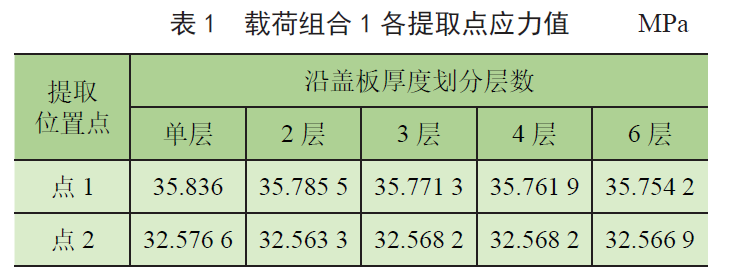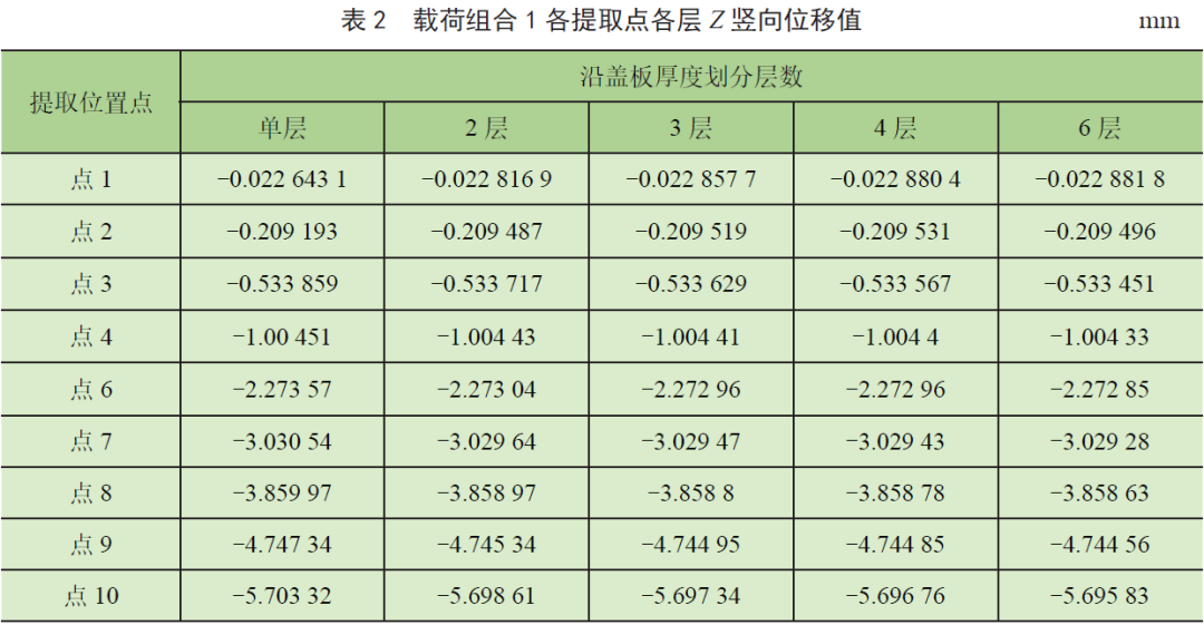 悬臂梁上盖板除厚度外沿板平面方向划分网格为50mm×50mm,载荷组合1 沿板厚度方向划分不同层数的计算应力值及竖向位移值,如表1、表2 和图8 所示。