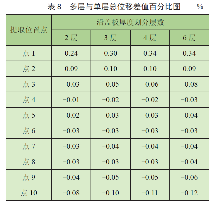 由总位移对比结果可知:在约束、载荷、板平面方向网格等条件相同的情况下,沿厚度方向划分层数对应力值影响较小;以单层计算值为基础,划分6 层网格、点1 处与单层计算差值最大,最大差比为0.34%,差值较小,如表8 所示。