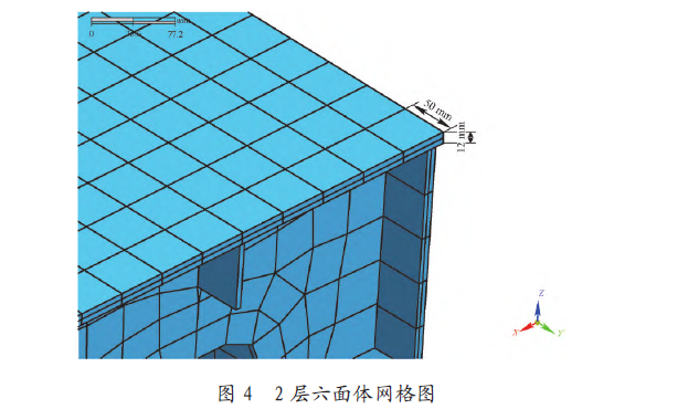 本次计算采用实体单元,为保证沿板厚方向能绝对分层,各板间采用焊接接触绑定处理。以悬臂梁上盖板为研究对象,上盖板全部为六面体单元。六面体单元为3D8 节点,每个节点有3 个自由度,即沿节点坐标系X、Y 和Z 方向的平动位移;积分点为2×2×2,积分方式为杂交,对受弯结构使用混合法或减次积分法的单元性能更卓越,本文中单元处理方法为混合法。