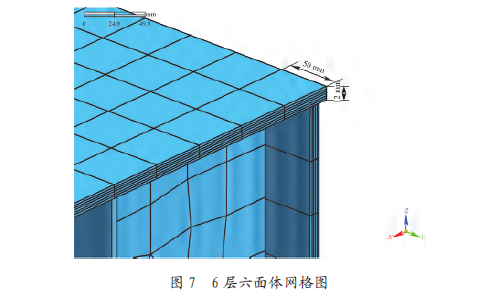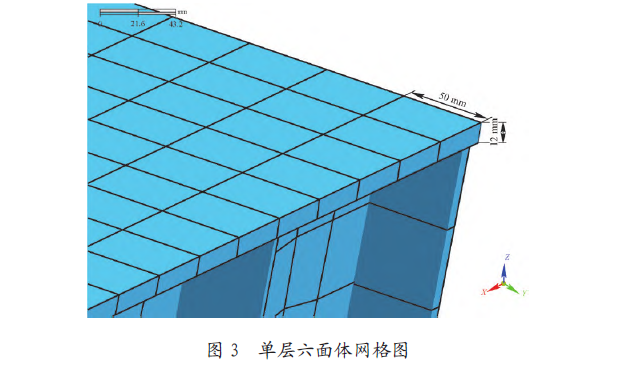 悬臂梁上盖板厚为12mm,沿厚度分别平均划分为单层、2 层、3 层、4 层、6 层共5个有限元模型;为保证上盖板均匀分层,上盖板采用2D-3D 映射方式划分网格。综合考虑精度及计算量,悬臂梁沿面板平面划分尺寸为50 mm×50 mm,上盖板采用一阶六面体网格,其余板以一阶六面体网格为主,一阶四面体网格为辅的方式将几何模型转化为有限元模型。