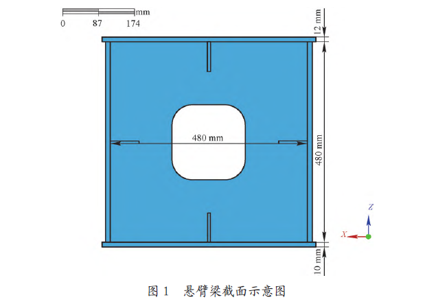 本文选取典型的薄壁箱形悬臂梁结构作为验证实例,采用大型有限元分析软件Midas NFX,对同一结构、同一块板,沿板厚方向划分单层网格和多层网格分别进行计算,分别提取同一位置处的应力和位移值进行比对。验证在相同条件下,同一块板在同一位置处,对比板厚方向不同网格下的计算值差别,从而确定力学模型的准确性。
