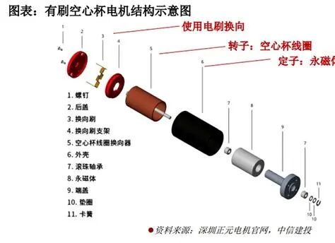 图中①磁铁(永磁体),②空心杯线圈,③换向器,④刷架,⑤外壳,⑥滚珠轴承等部件均在实际产品中出现。
