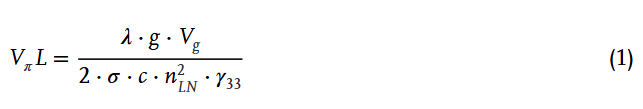 其中λ为波长,nLN为TFLN折射率,γ33为TFLN的电光系数,g为电极间隙,σ表示光模场与施加电场之间的电光重叠因子,而群折射率ng可按下式计算: