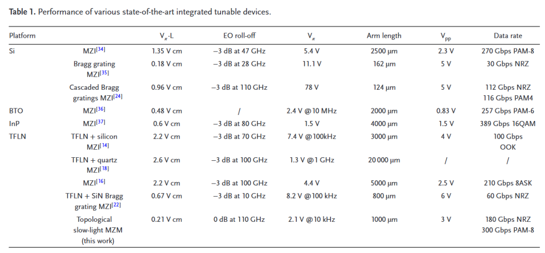 表1比较了先进芯片级调制器的各项指标。我们演示的拓扑慢光MZM是唯一在实现110GHz宽带的同时,调制效率低于0.5V·cm的器件。