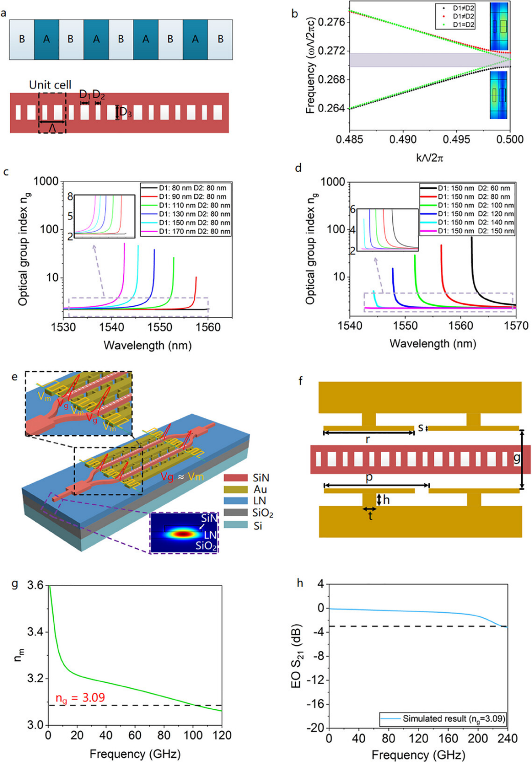 图1采用分段慢波电极的集成LN高效大带宽慢光MZMs调制器设计。a)一维拓扑光子晶体的介质AB层和结构组成。晶格的单元胞,周期为Λ,宽度为D1和D2,长度为D3。b)一维拓扑光子晶体的模拟能带图,显示最低(黑色)和次低(红色)能带。插图展示了能带边缘的交换模式分布,表明当翻转晶格时,在光子带隙(淡紫色 区域)出现了能带反转。c)次低能带和d)最低能带的群折射率与波长随D1和D2变化的色散关系。e)电光速度匹配的慢光MZMs调制器示意图。黑色虚线框插图:慢光波导和分段慢波电极的放大图像。紫色虚线框插图:混合LN和SiN波导的空间横向电场模式分布,LN能量占比为61.5%。f)分段慢波电极的设计。在本工作中,电极参数如下:周期p=50µm,边长h=t=4µm,电极间隙g=5µm,r=45µm,s=2µm。g)不同频率下的模拟微波折射率。h)模拟的EOS21曲线,显示器件的3dB带宽为235GHz。