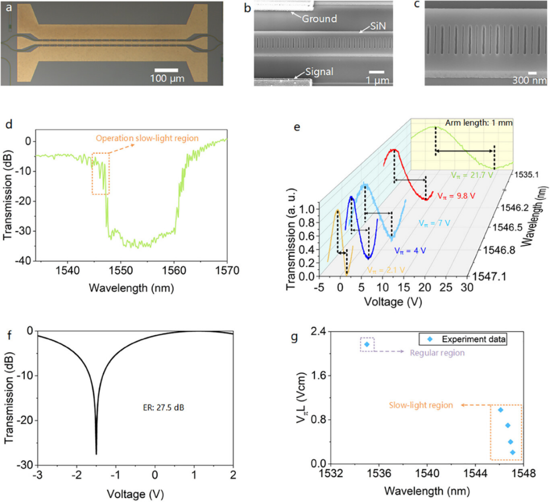 图2器件表征与静态电光性能。a)含波导与电极的器件光学显微镜照片。b)慢光波导与电极的扫描电子显微镜图像。c)带矩形空气孔的慢光波导放大SEM照片。d)MZM的透射光谱。e)归一化光学传输曲线,显示Vπ值分别为:1535nm波长下21.7V,1546.1nm下9.8V,1546.7nm下7V,1546.92nm下4V,1547.1nm下2.1V。由于光与物质的相互作用时间和群折射率增加,随着波长的红移,Vπ将逐渐降低至2.1V。f)1mm长臂在不同电压下测量的光传输,显示调制器在1547.1纳米波长时具有27.5dB的消光比。g)不同波长下测得的Vπ·L值。