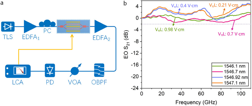 图3电光调制带宽。a)电光带宽测量实验装置。b)在1546.1、1546.7、1546.92和1547.1nm不同波长下测得的电光S21响应。平坦响应超过110GHz。