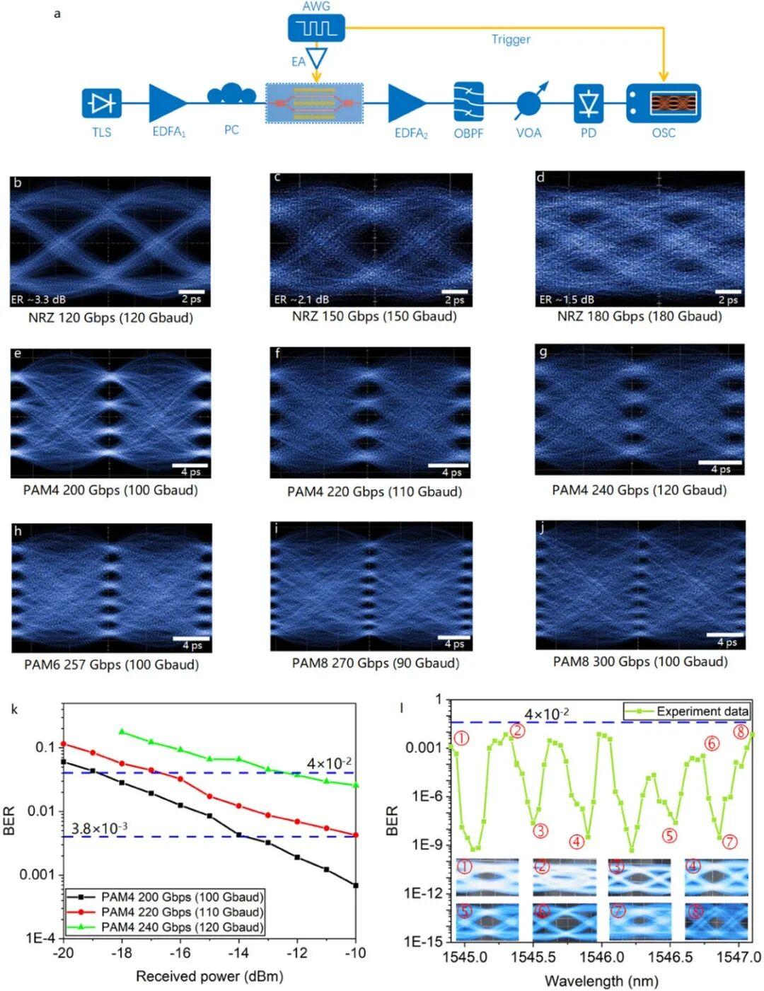 图4数据调制测量。a)用于测量光眼图的实验设备。b)120Gbps、c)150Gbps和d)180Gbps数据速率下NRZ信号的眼图。e)200Gbps、f)220Gbps和g)240Gbps速率下测得的PAM4调制格式眼图。h)257Gbps下测得的PAM6调制格式眼图。i)270Gbps和j)300Gbps下测得的PAM8调制格式眼图。k)PAM4信号在200、220和240Gbps数据速率下误码率与接收光功率的测量曲线。l)实验验证所提调制器在工作波长范围内的性能。插图:100Gbps NRZ信号在不同载波波长下的测量眼图。