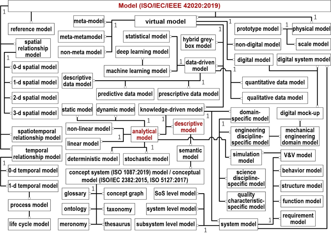 这个概念体系由实体的顶层本体、数字孪生体相关概念、数字孪生系统相关概念、分类框架相关概念、相关使能技术、模型多维分类体系(图5)等多个逻辑部分构成,为数字孪生领域的核心概念及其相互关系提供了清晰的、本体意义上的界定。