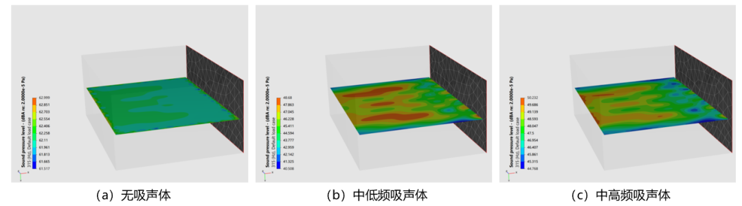 仿真评估了无吸声体、铺设中低频吸声体及铺设中高频吸声体情况下的声压级及降噪量。结果表明,中低频和中高频吸声体的组合使用,能够显著降低主控室内的噪声水平。