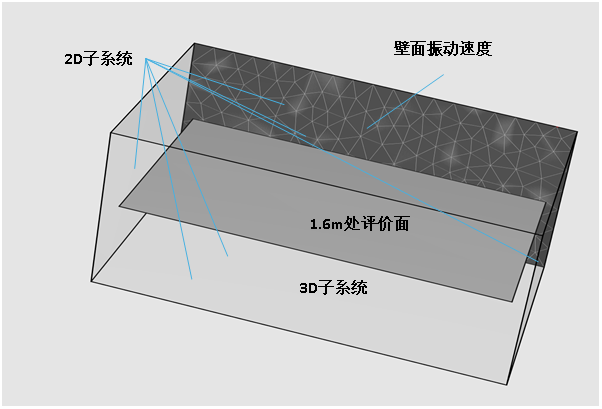 本研究以某核电站主控室为对象,构建了包括主控室内部空间、壁面与顶部、评价面及壁面振动速度激励的仿真模型。通过3D子系统描述主控室内部空间,2D子系统描述顶部与壁面,评价面用于评估人耳处的噪声声压级。
