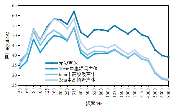 图7不同厚度中高频吸声体下主控室声压级频谱