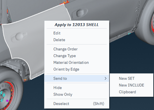 在ANSA v25中,在选取完实体后,可以右键执行与该实体类型相关的操作,大幅提高操作效率。例如快速将选取实体添加进新的集 合(SET)或Include文件中。并且,可使用的快捷操作可通过脚本自定义,实际案例可至文末查看。