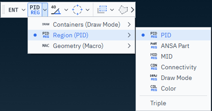 Region(连通域):在容器选取的基础上限定了选取的边界。例如同样激活PID作为容器类型, 点击任意单元,系统将选中与该单元同属于同一PID下且位于连通区域的可见单元;若激活Triple,则系统会将三面交界处视为边界,超出边界的单元不会被选取。