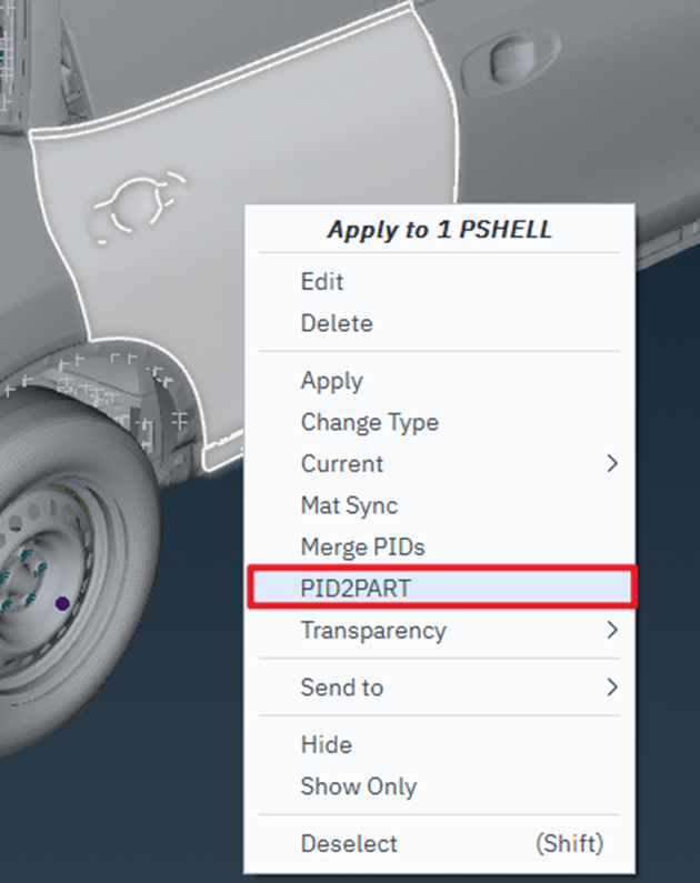 重启ANSA,现在在选取PID后右键会显示一个新的快捷操作,名称为先前定义的PID2PART。点击后会生成一个新的ANSA PART,其名称与PID名称相同。