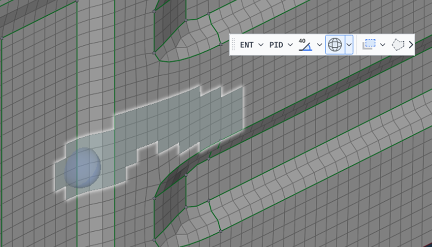 在ANSA v25中,新增了笔刷工具。可通过鼠标拖拽笔刷实现"涂抹式"智能选区,自动识别连通区域,还可通过按住Shift键实现反选。