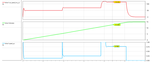 为了对L1的指标分配工作进行评估,可建立整车的仿真模型,通过不断运行和修改模型,对设计进行迭代,从而达到这一阶段的最有设计。如图 10所示,为L1层级的仿真模型和其内部构造。该模型分成了车体动力学、电池、电驱、热管理和司机五个系统。其中,车体动力学系统仿真模型是根据外形、结构布局和各个子系统的重量分配等设计结果做出的。电池、电驱、热管理系统都是遵循能量守恒的等效系统仿真模型。司机模型是一个PI控制模块,从而模仿司机根据给定的车速踩油门的动作。如图 11所示,为模型按CLTC标准进行的仿真结果,红色曲线是速度值,绿色曲线是行驶距离,蓝色曲线是油门值(刹车值未在图中表示)。总体设计者可按自己对场景的需求自行设计模型输入量,从而对车辆加减速性能、续航、安全性等进行大方向上的评估(车体动力学虽然具备转弯受力方面的能力,但是其他系统没设计这方面功能)。这个模型里的参数数值,即为L1级设计环节向各个L2级子系统设计环节分配的设计指标。总体设计者可通过不断修改参数运行仿真,获得最优化的设计指标配置。各个子系统设计者,也可以根据这一模型的运行结果协商各自分配的设计指标。