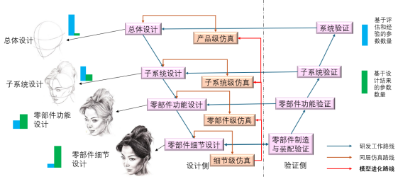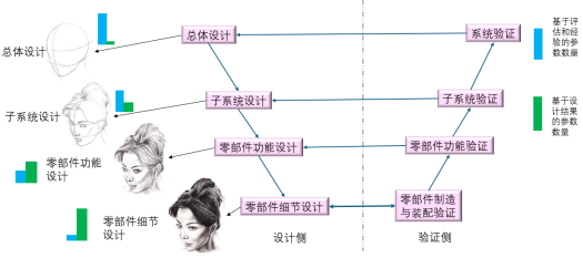 在产品研发开始时,设计者并不清楚该产品的任何细节或确凿的参数数据,只能根据理论或试验分析,对某些关键参数进行估值。如图 1中的蓝色与绿色竖条所表示的。蓝色竖条表示基于评估和经验的参数数量,绿色代表基于结果的参数数量。在左上角,即总体设计环节时,设计工作为框架性设计。根据产品的设计需求,对产品的总体框架进行设计。其设计结果包括各个子系统的设计指标、互相间的连接方式,以及这些子系统总体的空间布置等。因此,这一环节会有很多“吵架”发生。各个子系统设计部门的领导,会为了本部门的指标“吵架”。例如,如果一款新能源车是正向研发的,在整车重量为确定的设计指标下,电池研发部门和电驱研发部门,都会为本部门争取更大的重量,从而降低本部门的设计难度,但这无疑会提高其他部门的设计难度。