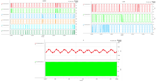 动态过程主要是考虑到了控制信号、电压/电流的变化引起的, 一般会影响到电机的加减速或转动稳定性等情况。相比于功率、效率等时间平均特性,属于随时间变化的特性,因此为动态特性,需要在静态设计基础上进行更细致的设计来实现。由于控制芯片的SVPWM信号频率极高,使得仿真必须以极小时间步长(一般为微秒级),导致动态电驱系统的仿真总时间无法设置太长(一般极限是秒级),故无法集成到整车模型中。只能在设计过程中起验证作用。如图 19所示,为动态电驱系统模型的仿真结果。左上角为控制芯片发送给逆变器的控制信号,右上角为电机的电压值,下方为电机a相电流值和电机的功率值。三个图的时间尺度不相同,请勿横向比较。