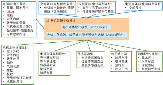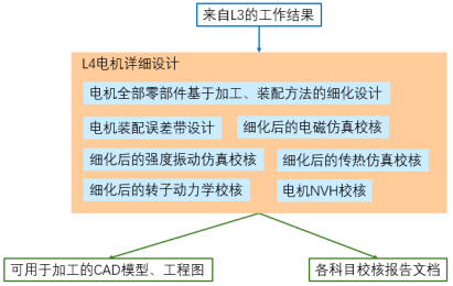 L2层的工作,需承接L1的输出结果。其中,有直接指派给电驱系统的设计指标,同时,也需要综合考量其他系统对电驱系统的需求。在这些综合的输入下,进行本子系统的设计,并在设计中保持跟总体和其他子系统设计部门间的顺畅沟通,以便在某些局部问题上的修改与权衡。L2的设计结果包括。电机、变速器、控制器等多个更细分部件的设计指标。