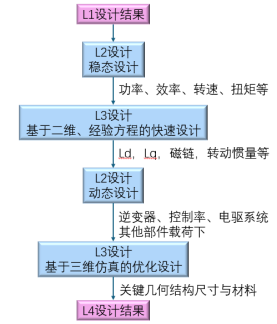 然而在实际设计过程中,控制规律、逆变器等的设计,往往是给已设计好的电机进行配套设计。所以,流程上需要先进行电机的L3设计。为了尽量确保设计的非盲目性,本案例对设计流程进行了更细化的迭代处理。首先要开始一轮L2设计。但是这一设计主要是以稳态工况为设计目标,着重对电机的功率、效率等与能量有关的指标进行分配。然后进行L3(电机)的快速设计。这种快速设计也以稳态为主,通过二维、经验方程等方式完成设计。完成L3(电机)的快速设计后,再回到L2,进行逆变器、控制策略等配套设计。这些设计是为了实现电机的动态指标。当完成逆变器、控制册率等的设计后,再回到L3进行深入的,基于三维仿真的优化设计,从而完成L3的全部设计。具体的迭代过程如图 14所示。