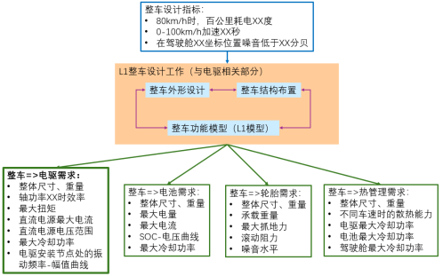则L1的设计工作除了对壳体、结构布置的设计外,还要对电驱、电池、轮胎、整车热管理等子系统给出相应的指标(本示例非实际案例,仅包含有限数量子系统)。具体内容如图 9所示。