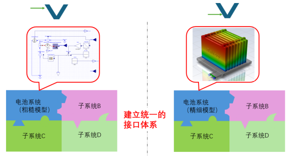 产品研发中有各种模型,本文所指的模型为仿真模型。图 3中的红色箭头,就是模型的进化路线。它是从下到上的跨层级进化。由于在正向设计的起始点(图 2中的左上角工作环节),设计者还没有进行后续的更详细设计(这也是为什么在这一时期难以进行实物测试的原因),无法建立起精确的仿真模型,所以只能建立粗糙的、颗粒度较大的、甚至是等效的仿真模型。在完成更下层的设计后,设计者可把相应的部分替换成更详细的模型。随着设计的持续进行,仿真模型将越来越精细,直到完成所有设计。这时的仿真模型将包含所有设计信息。这个不断细化的过程,就是模型的进化。当完成全部验证与参数调试后,该仿真模型即可成为该产品的数字孪生模型(基于仿真的数字孪生)。如图 4所示,为新能源车设计中,整车模型里用于热管理的电池系统细化示例。在设计开始时,设计者把电池系统建模成充放电规律近似的等效电路和与之适配的发热模型(遵循能量守恒的简单方程组)。随着设计工作的进行,当完成最后的电池设计(或采购)后,把该等效模型替换成含有全部设计结果的电池3D仿真降阶模型。