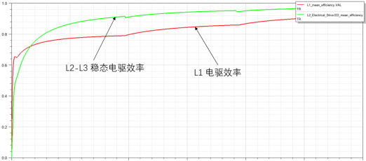当L2-L3第一轮设计结束后,可把建好的模型连入L1的整车模型,并对两个模型的计算结果进行对比,检验这一设计是否沿着正确的方向进行。在这一过程中,整车模型进化了。如所示,为L1层的模型和L2-L3稳态模型的CLTC运行结果效率曲线对比。