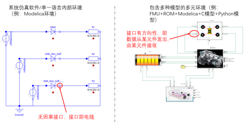 细心的读者能够发现,图 5里的所有接口,都是有方向的。这实际上相比与目前系统仿真里普遍存在的无因果接口是落后的。之所以把接口规则定成这样,不仅仅是为了适配系统仿真模型,还包括了仿真用的降阶模型,C、Python等语言编写的程序,甚至传感器数据等等多种多样的模型与数据。具体的不同如图 6所示。