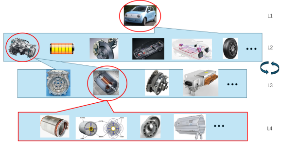 如图 8所示,本文将新能源车的研发过程大致分成的四个层次,从总体层到最底层分别取名为L1-L4。在正常研发流程中,越往下曾的工作分工越细,因此无法全部在示例中表示,因此图 8中的示例只展示了整车=>电驱=>电机=>电机零部件这一部分的内容。其中,由于L2和L3层在现有厂商的工作流程中普遍存在逆向与正向混合的现象,而且这种逆向和正向混合设计的工作流程,已成为一种较为成熟的工作方式,所以在图中以迭代的形式表示。另外,为了强调本文的整体性,本案例着重在L1、L2和L3的部分工作上展开。