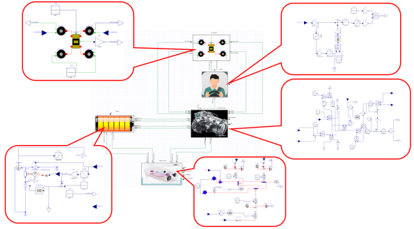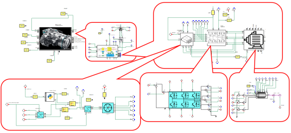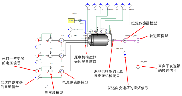 L2第一轮设计主要是把电机、逆变器和控制率作为一个整体(电机驱动系统)进行的设计。在这一轮中,先考虑其稳态特性(即大时间尺度的特性)。这时,系统中的波动来源主要是热、机械等。由电压/电流造成的波动频率远高于热和机械,因此先不考虑,采用能量方程进行建模。由于L2与L3第一轮设计的关系紧密,一般建模是一起完成的。如所示为稳态设计的L2-L3模型。其中的电机模型是基于电机设计软件结果生成的FMU模型。