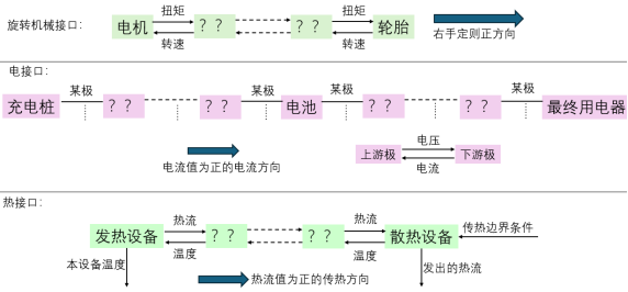 为了使接口保持一致,设计者必须在产品设计的最初始阶段,就把所有的接口设计好,并保证在整个设计过程中,接口不会因为设计的细化而发生变动。这一要求的本质是确保系统仿真模型的方程组具有唯一解。因此,设计者需要对各个学科的物理机理具有极深刻的认识。设计者需要在对某一学科的理解基础上,制定出一套接口的连接规则,并在整个设计过程中遵照规则执行。如图 5所示,为某新能源车设计流程中的部分学科模型接口规则。