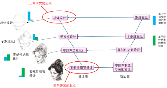 一直以来,产品研发过程都存在正向和逆向的区别。概括来说,正向是指从总体到局部的设计,逆向则是从局部到整体的逐步改进。如图 1所示,为产品研发的一般流程的V形流程图,可以解释产品研发的正向与逆向的区别。图中的工作环节按V字形排列,左侧为设计环节,右侧为验证环节。从上到下又分若干层级,图 1中以四个层级为例。越接近上层,越偏全局,越接近下层,则越偏局部。
