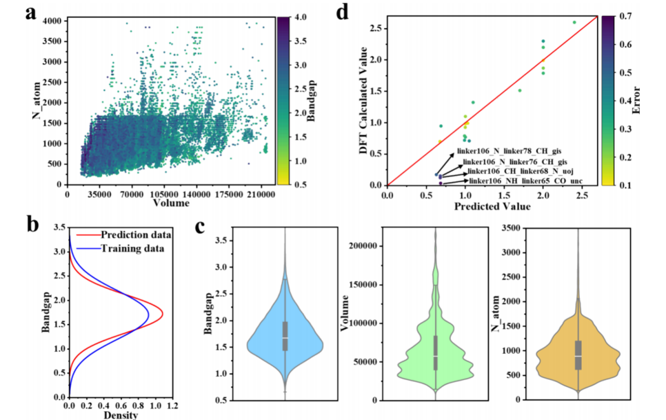 (a) 基于Mercado COF数据库中41,579种COF材料的预测带隙汇总图,展示了晶胞体积与原子数量函数关系下的带隙分布;(b) 通过概率密度曲线对比预测数据与训练数据集中的带隙值分布特征;(c) COF材料带隙值、晶胞体积及原子数量三个参数的统计分布规律;(d) 模型预测带隙与密度泛函理论计算值的相关性对比分析
