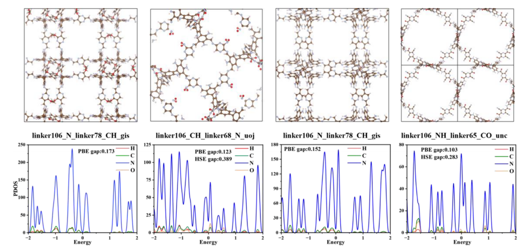 PWmat 的作用不仅仅是提供一个数字(带隙值),它还用于深入理解材料的电子特性。对于筛选出的最有前途的低带隙 COF,研究者使用PWmat计算了它们的PDOS。通过分析 PDOS,发现了费米能级附近的电子态主要由氮原子贡献,而非通常的碳原子,PWmat 提供的详细电子结构信息,对未来设计导电COF提供了多引入氮元素的新的分子设计思路。