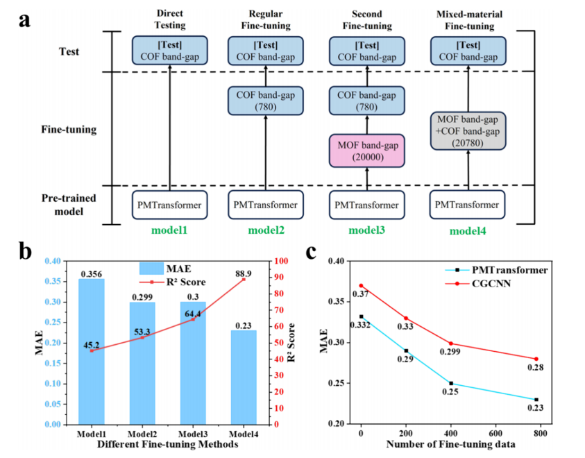 (a)四种不同用于预测COF材料带隙的微调模型示意图;(b) 四种微调模型的平均绝对误差(MAE,单位为eV)与R²评分对比;(c) 以MAE为评估目标的PMTransformer与CGCNN模型学习曲线