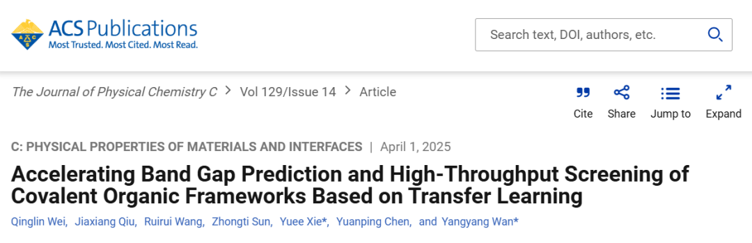 共价有机框架(COFs)是一类结构可能性近乎无限的材料,这使得快速识别具有特定性质(尤其是电子性质)的COF极具挑战性,为解决数据稀缺和计算成本高的问题,本研究应用迁移学习技术,通过在各类COF数据集上对预训练模型(PMTransformer)进行微调,克服了上述限制,实现了COF带隙的快速预测。最终模型可准确预测COF带隙,平均绝对误差为0.23 eV,R²值达0.89,性能优于晶体图卷积神经网络模型。通过在独立的COF数据集上使用密度泛函理论(DFT)计算验证模型预测结果,证实了预测带隙与DFT计算值的一致性。将模型应用于大型COF数据库时,筛选出了具有潜在(半)导电性的COF,表明该模型有望成为高效筛选工具,用于发现具有优化电子性质的COF,文章发布于《The Journal of Physical Chemistry C》,DOI:10.1021/acs.jpcc.5c01307