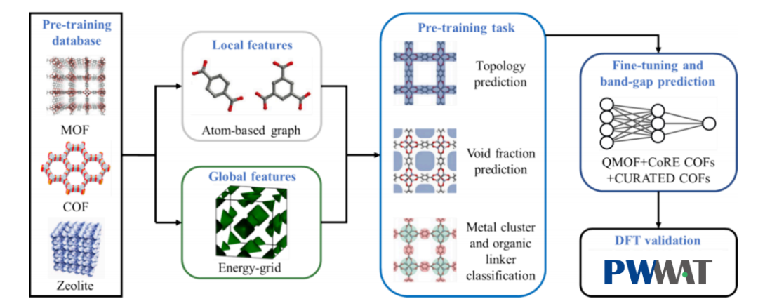 本研究采用迁移学习的机器学习策略,对“PMTransformer”的预训练模型进行微调,能够快速、准确地预测COF的带隙,PMTransformer是一个专门为多孔材料设计的 multimodal Transformer多模态模型,最初使用PORMAKE程序生成的190万个假设性多孔材料结构(如MOF、COF、沸石等),在这个数据库上进行预训练。