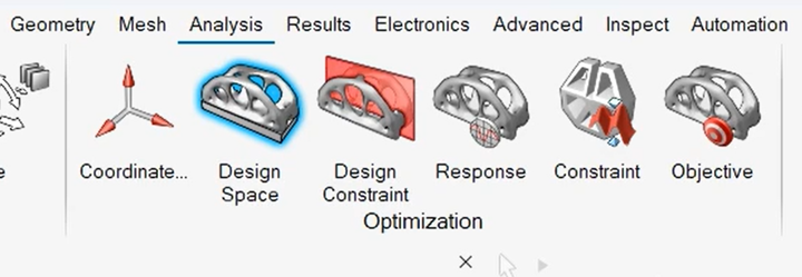 接下来,我们来完成拓扑优化的基本设置,在SimLab中,将我们需要进行的基本设置的图标整齐的排练在一起,我们按顺序点击并设置即可: