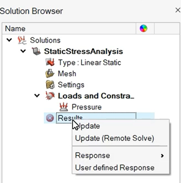在Solution中,右键点击Result,在弹框中选中Update即可开始进行计算。当计算完成,Result前面的圆形图标会自动变绿,这时即可查看计算结果了。