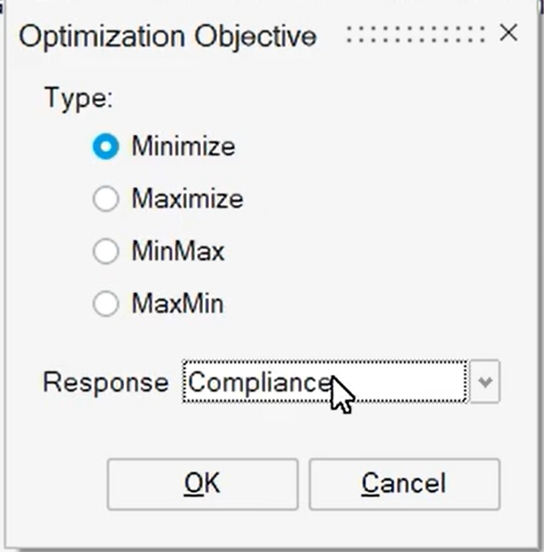 点击Objective设置目标为刚度最大化(即柔度Compliance最小化)