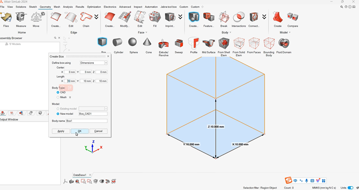 快速创建一个尺寸为10mm*10mm*10mm的晶格;