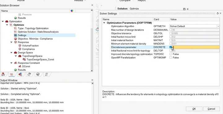 DISCRETE的值可以在拓扑优化的Solution中,点击Setting—> Solver Settings,进行设置,如果不设置,其默认值为1。