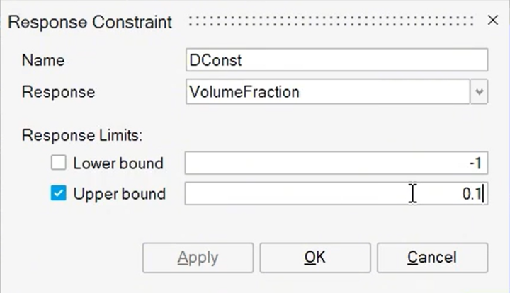 点击Constraint定义约束:体积分数<10%, 即将上限设置为0.1