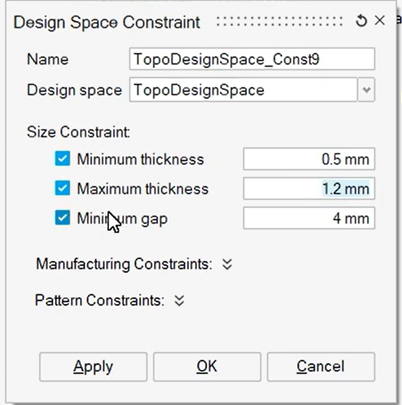 之后,点击Design Constraint, 设置设计约束,其中最小成员尺寸0.5mm, 最大成员尺寸1.2mm,如下图所示: